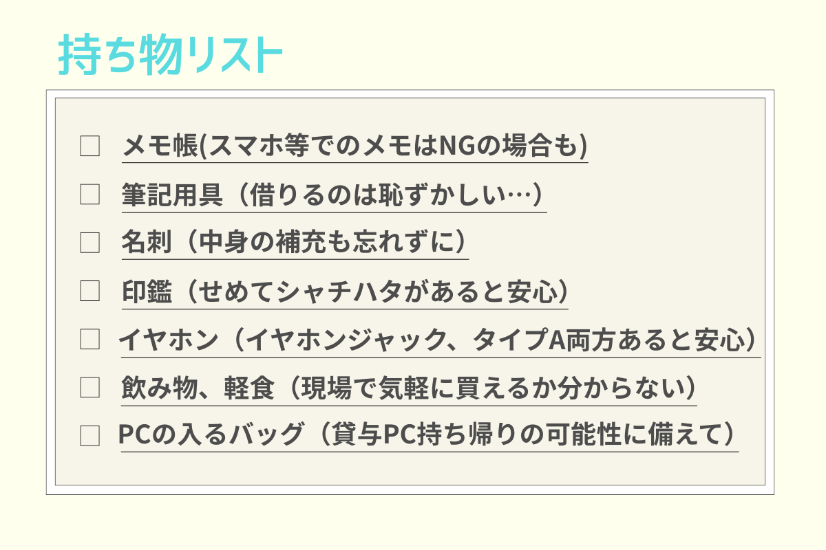 必要なものは事前に確認する方も多いと思いますが、意外と落とし穴なのが「持ち込んではいけないもの」の確認です。現場によっては、メモ帳代わりに〜と自社PCを持ち込んだことでセキュリティ上のルール違反になることも...。