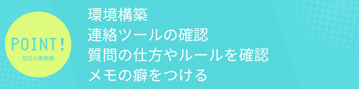 今後の業務理解としては、上記に挙げたような使用ツールやフレームワーク、プロジェクトの背景などを怖がらずに質問することが大事です。