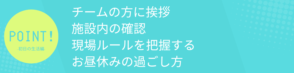 続いて初日の現場でまずはどんなことをするのか、どんな過ごし方をすれば良いのか、業務面と生活面にわけてみていきます。