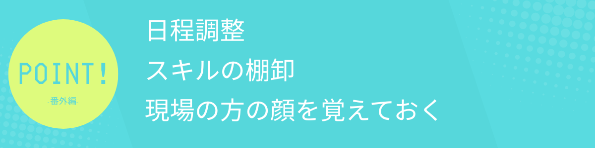 面談の他に、セキュリティ教育があり現場参画前に合計2回訪問の機会があったので、現在別の現場で働いている人はその現場のスケジュールとも検討しつつの日程調整が必要になります。私の場合は、一緒に現場参画する上司が先方との日程調整の対応をしてくれたので、上司と相談しながら日程調整をしました。